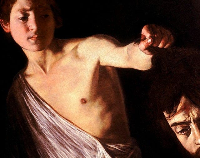 Here there is a cohering splendor: a drama that could be recited in the same breath as the Hildebrandslied without cause for comment—the sort which by nature is situated into that of the age-old contests of brother against brother, and (by a quite natural turn of psychological reflection) man against himself. Consider—is it a mere coincidence that art historians have long speculated that Caravaggio’s David with the Head of Goliath may well be a double-self-portrait? Given this and that all assertions of relation entail that of a sort of unity, could we not then imagine further that when the smooth river stone from David’s sling hit Goliath’s skull that the ensuing thud was a sort of echo of Galatians 3:28?5 Could we not imagine that in enmity there is always in each enemy a hidden likeness rendering difference and distance and relativity as such into illusions obscuring a single, sublime point of unity?